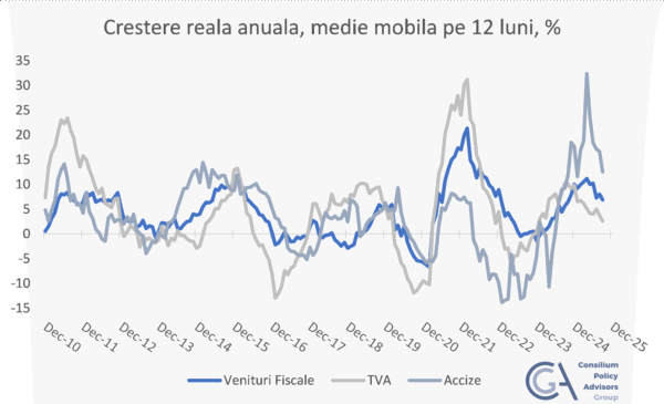 Un aspect pozitiv este faptul cӑ veniturile din TVA și accize ȋncӑ avansau ȋn septembrie cu 2,6% și 12,5% repectiv ȋn termeni reali, ȋnsӑ cu un efect de decelerare mult mai vizibil decât ȋn lunile precedente. In fapt, ceea ce se observӑ, este cӑ veniturile totale fiscale ȋnsele au o tendințӑ de scӑdere, coborând de la o ratӑ anualӑ realӑ de creștere de 11,2% ȋn aprilie la 6,9% ȋn septembrie. Chiar dacӑ este prematur pentru niște concluzii ferme, faptul cӑ rata anualӑ de creștere a veniturilor continuӑ sӑ decelereze, este un semnal ȋngrijorӑtor. Este foarte probabil ca și efectul marginal al noilor taxe ce vor intra ȋn vigoare la ȋnceputul lui 2026 asupra veniturilor bugetare sӑ fie mai redus decât se anticipeazӑ astӑzi.